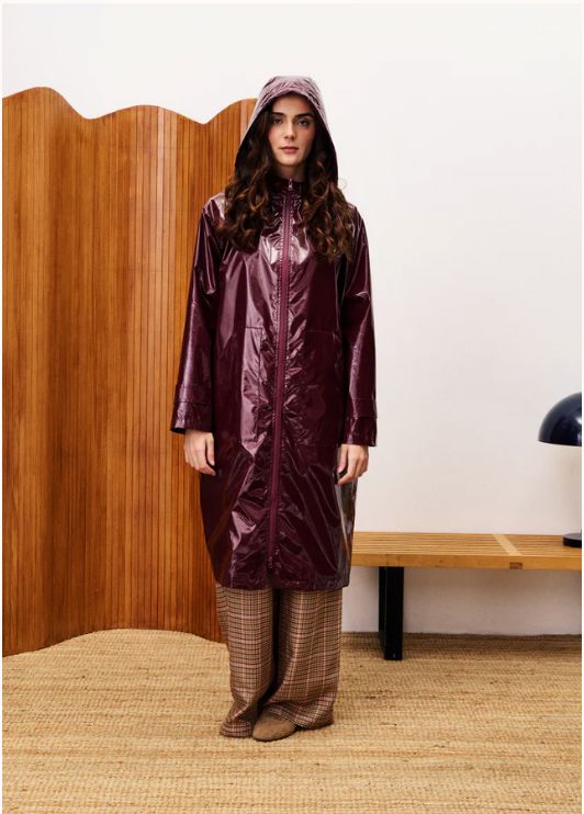 Parka bordeaux style ciré coup vent. Coupe droite et longue. Manches longues et capuche. Se ferme avec une fermeture. Deux poches. Coutures contrastées.