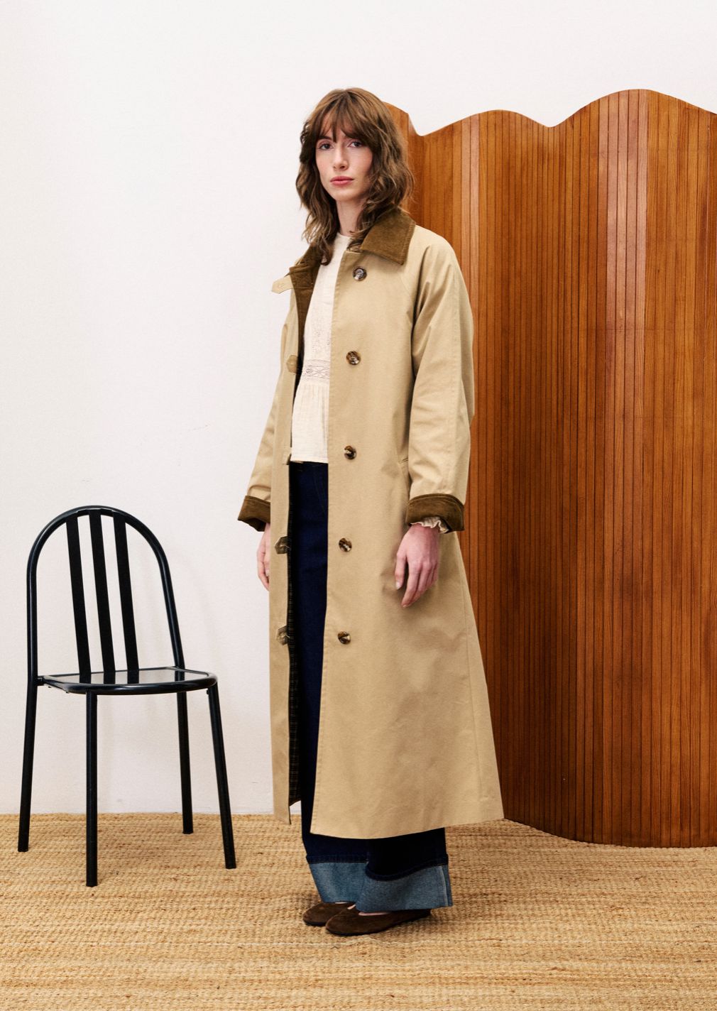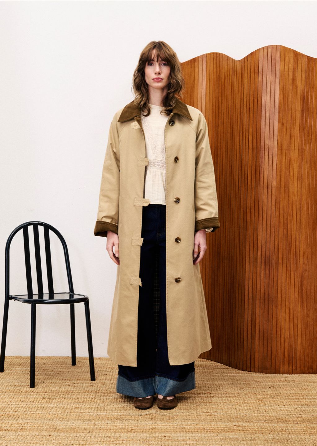 Trench long en coton. Ceinture amovible. Fermeture boutonnée et ceinture à nouer à la taille. Poches latérales. Col contrasté en velours marron.