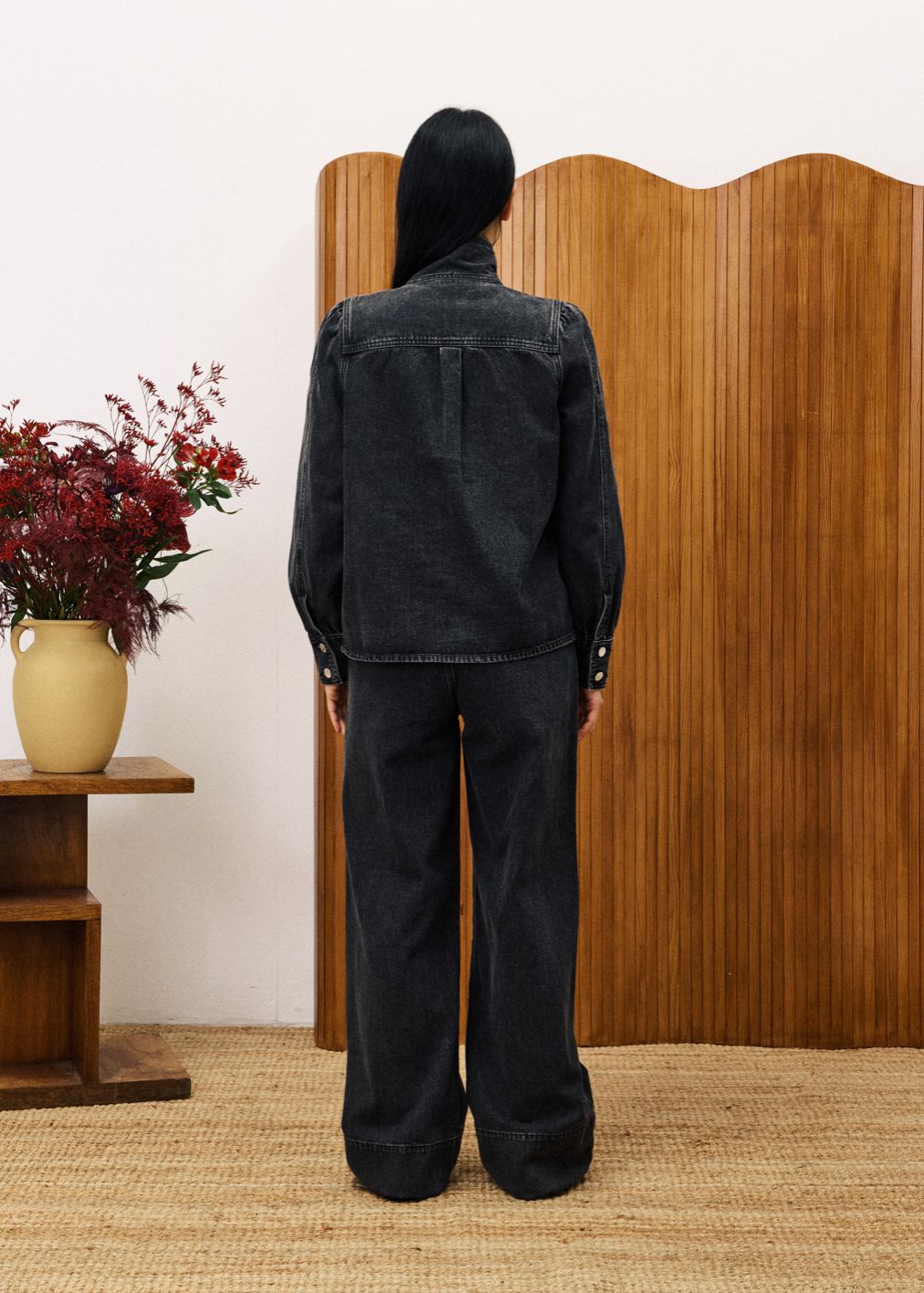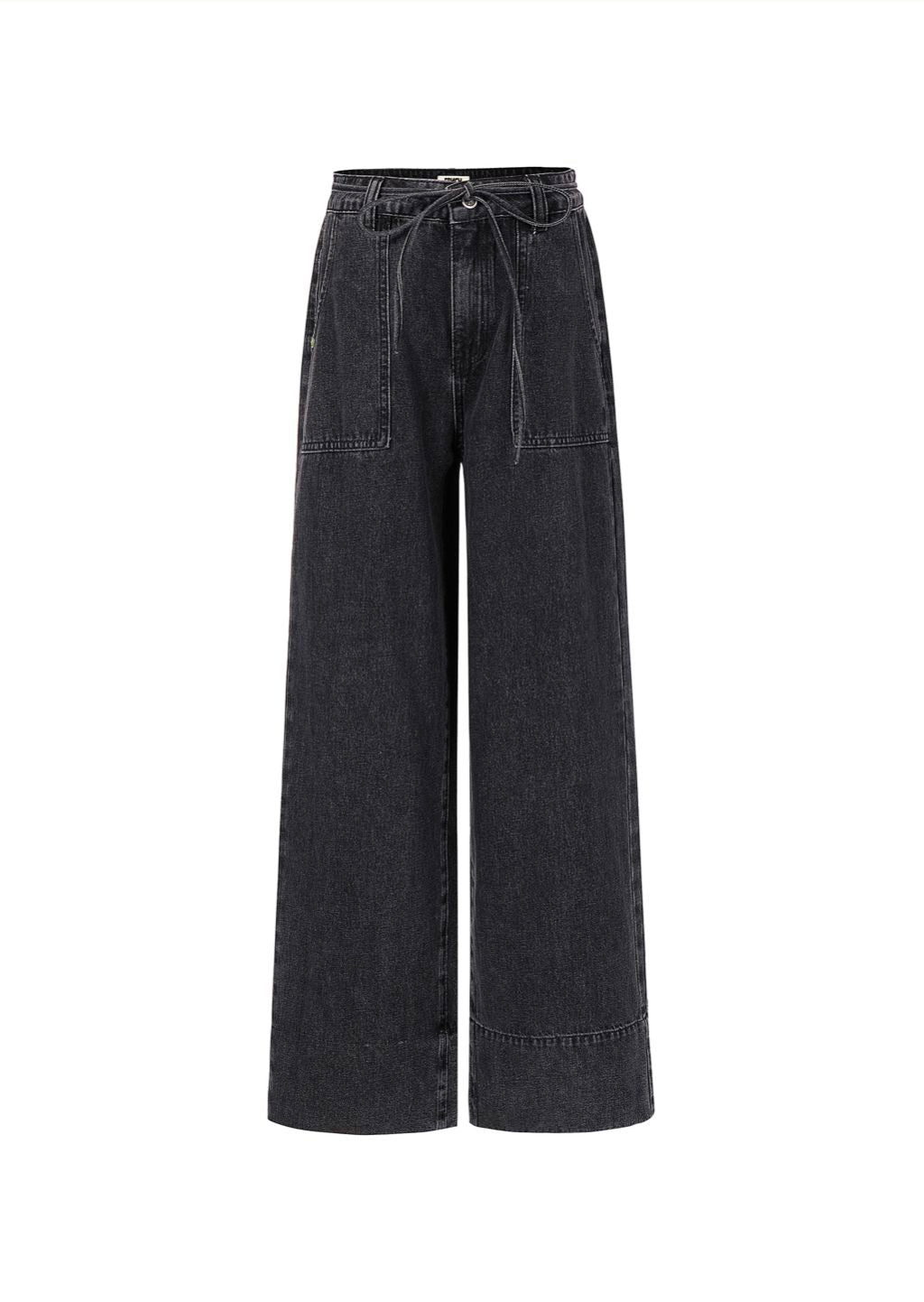 Pantalon en jean. Jambes larges. Deux poches avant et deux poches arrière.