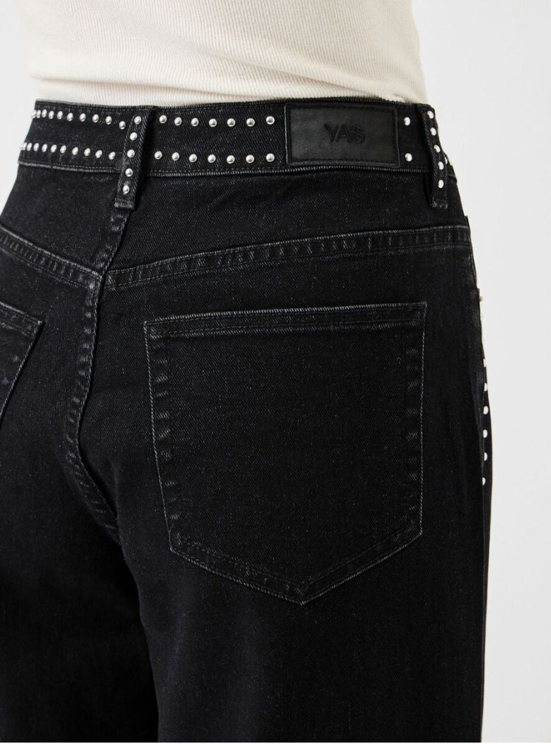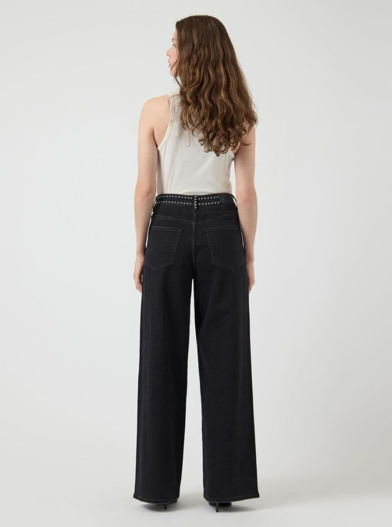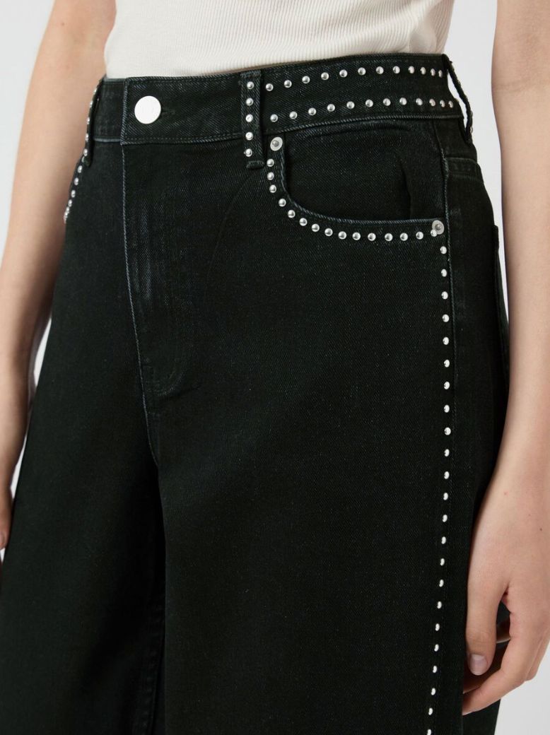 Jean clous. Fermeture éclair surmontée d'un bouton. Poches arrière, poche à monnaie, poches avant. Taille haute. Coupe droite.