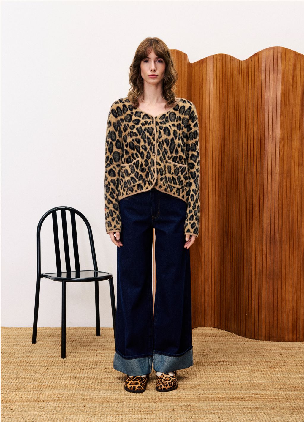 Coupe courte et droite. Encolure ronde. Fermeture par boutons. Deux poches plaquées. Maille douce effet mohair. Imprimé léopard all-over.