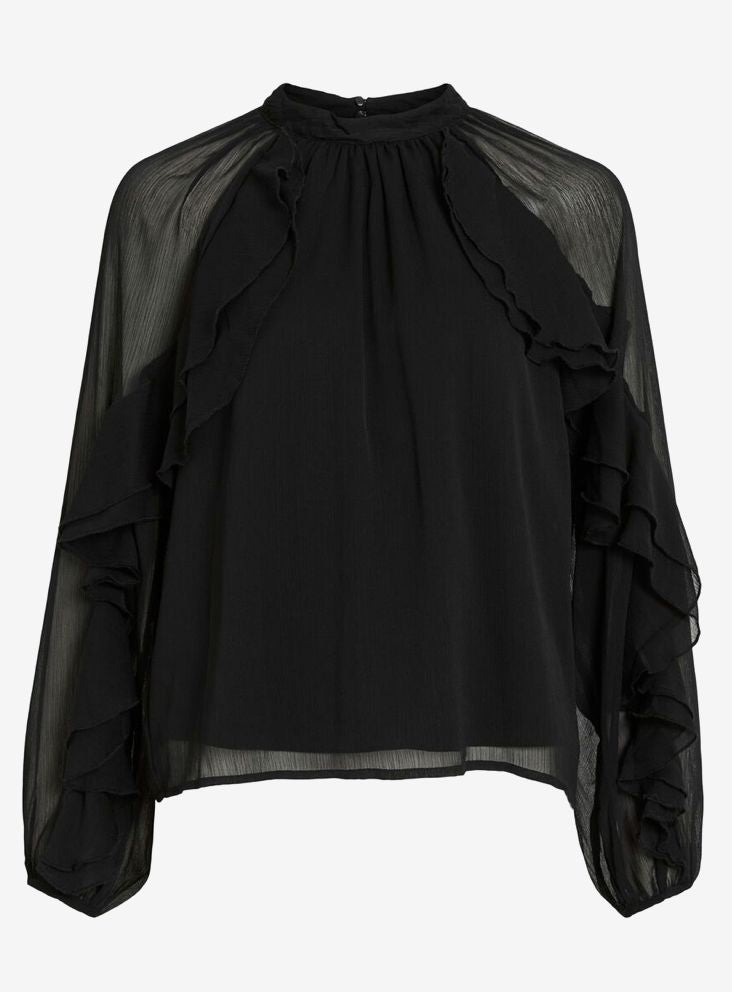 Top à manches longues à volants. Col montant avec fermeture boutonnée. Poignets à un bouton. Corsage doublé avec superposition transparente.