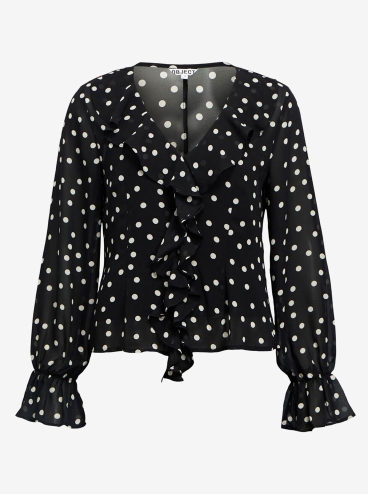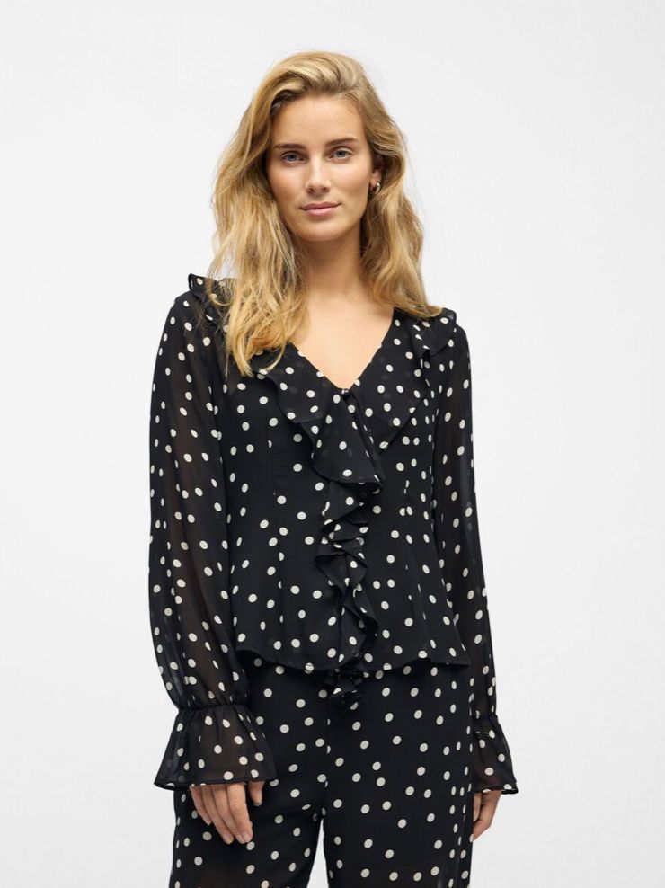 Chemisier à col en V à pois. Bordures à volants. Manches longues. Poignets élastiqués et évasés. Boutonnage sur le devant. Coupe classique.